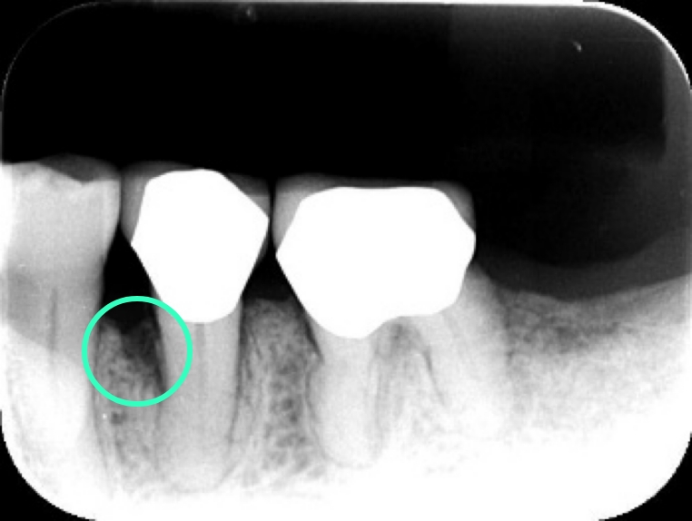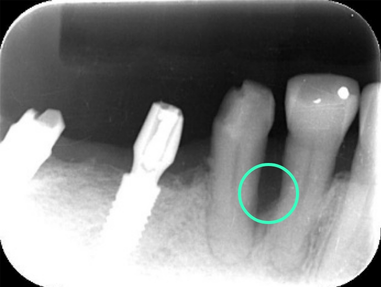 特に噛み合わせの変化は、歯根破折(歯の根が竹を割ったように割れてしまうこと)と歯を支えている歯槽骨の垂直的な吸収を引き起こしますが、噛み合わせの変化は緩やかに進行するため、自覚症状はほとんどありません。さらにこの特異な咬合状態が続くと、歯周病菌の影響で歯槽骨の垂直性吸収が起こり、破壊された骨は膿となって歯肉の中に溜まっていきます。その結果、歯肉が急に腫れ、噛むと痛みが出てくる (咬合痛)事態へと発展していきます。レントゲンでは歯槽骨の吸収が顕著に見えます。(レントゲン写真参照)